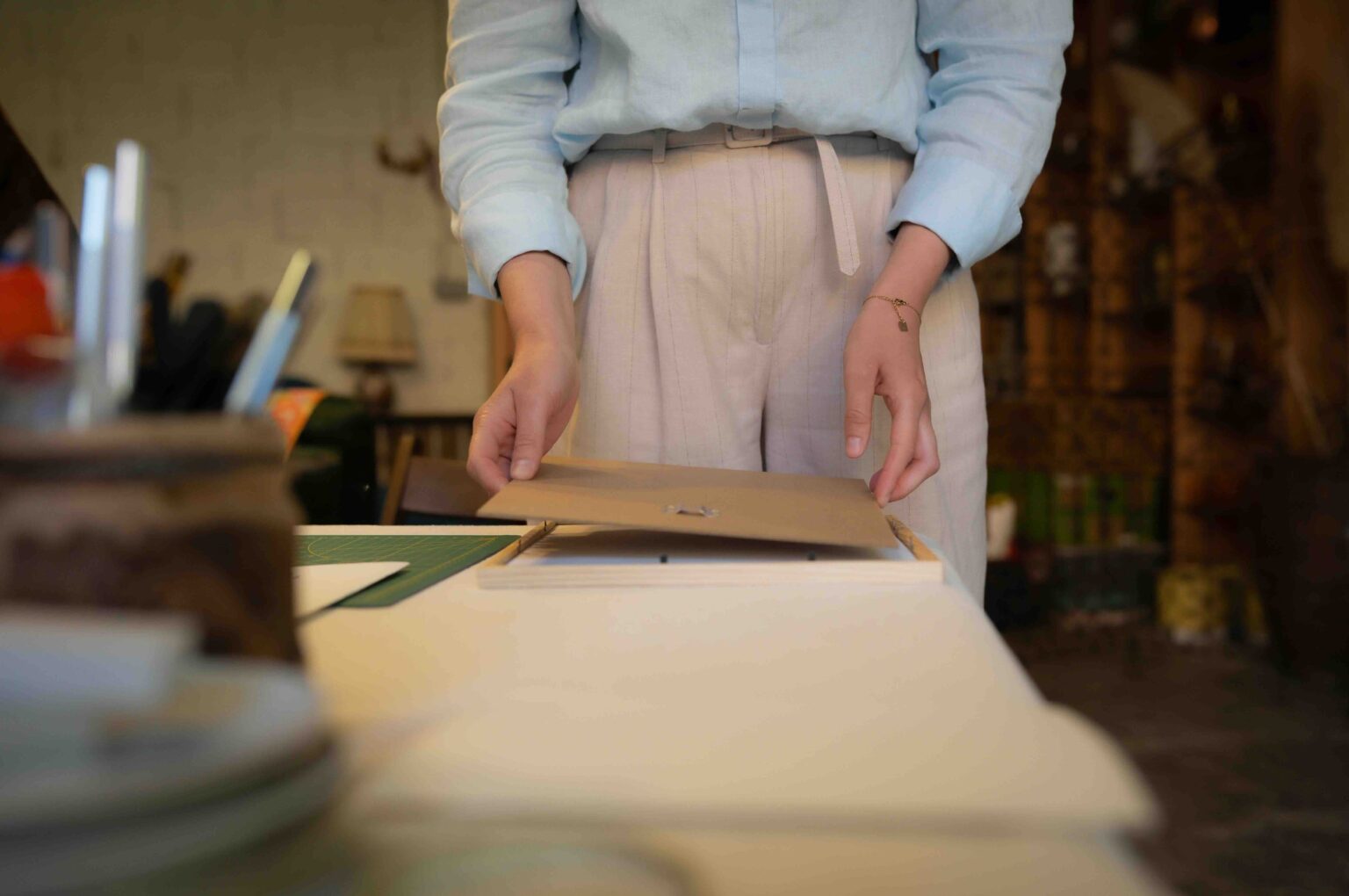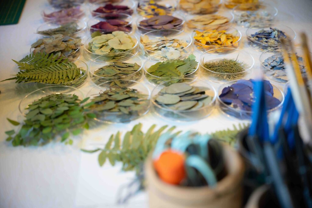 Je cultive la grande majorité des végétaux utilisés et sèche, ensuite, pétale par pétale chaque fleur ou feuillage. Après un temps de séchage de quelques semaines, vient ensuite le travail de composition et de collage afin de créer les herbiers fleuris et colorés.