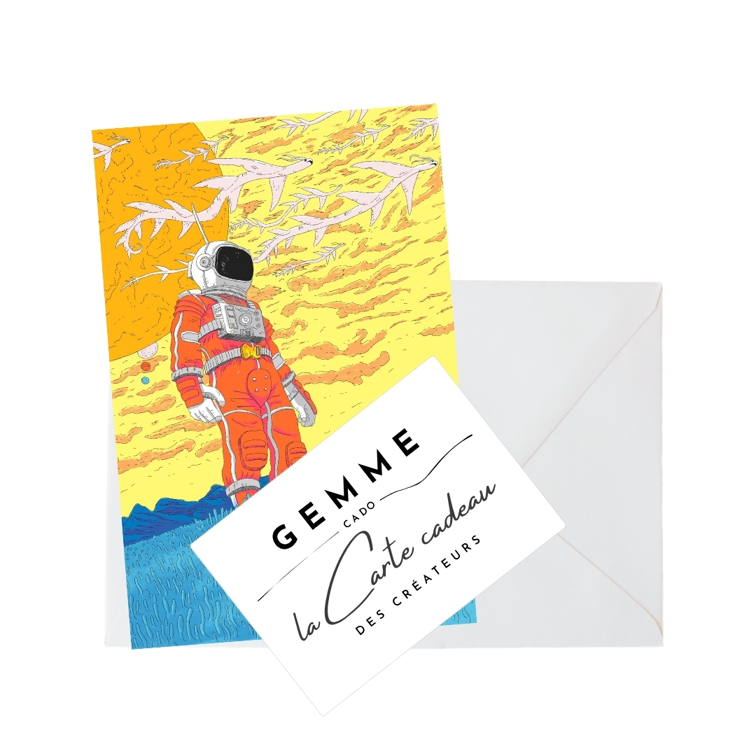 Chaque carte-cadeau GEMMEcado est composée d’une carte-cadeau au format carte de visite et d’une carte postale au format A6. Les deux cartes vont toujours de pair : elles sont vendues ensemble et contiennent la même illustration. La carte-cadeau pourra être glissée dans le portefeuille pour l’avoir à portée de main en cas de coup de cœur chez l’un de nos partenaires. Quant à la carte postale, elle pourra être réutilisée comme décoration d’intérieur ou autre selon l’envie.